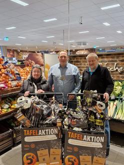Das Bild zeigt den Marktleiter Herrn Goraszda mit Petra Edinger und Wolfgang Keller, die Stellvertretend für die Tafel die Spendentüten in Empfang nahmen und sich für die fortwährende und kontinuierliche Unterstützung bedankten.