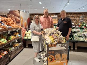 Das Bild zeigt den Marktleiter Herrn Thomas Gorasdza mit Petra Edinger und Wolfgang Keller, die stellvertretend für die Tafel die Spendentüten in Empfang nahmen und sich für die fortwährende und kontinuierliche Unterstützung bedanken.