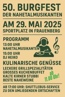 Am Donnerstag, dem 29. 05. 2025 (Christi Himmelfahrt), laden die Nahetalmusikanten zum 50. Burgfest am Sportplatz in Frauenberg ein. Beginn ist um 11:00 Uhr. Auch in diesem Jahr wird wieder im großen Beduinenzelt gefeiert – ein stimmungsvoller Treffpunkt für Musikliebhaber, Familien und Freunde aus der ganzen Region.