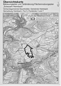Der Ortsgemeinderat Heimbach hat in seiner Sitzung am 09.11.2022 die Aufstellung des Bebauungsplanes „Solarpark Heimbach“ beschlossen.