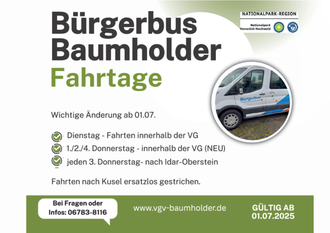 Die Verbandsgemeinde informiert über eine wichtige Änderung im Fahrplan des Bürgerbusses: Seit dem 1. Juli 2025 entfallen die Donnerstagsfahrten nach Kusel (01. Donnerstag im Monat) und Birkenfeld (2. Donnerstag im Monat). Der Grund für diese Anpassung liegt in der geringen Auslastung dieser Strecken seit Jahren.