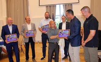 Stadtbürgermeister Günther Jung, Bürgermeister Bernd Alsfasser, Jan Schmidt, den Kommandanten des Truppenübungsplatzes, Jörg Zorbach vom Innenministerium. Aber das war noch nicht alles: Kim hatte auch einen Coin produzieren lassen. Diese Coins haben Tradition beim US-Militär. Auch sie werden in Ankerkennung besonderer Verdienste bewährt. Zum 70. Jahrestag ließ Coin eine solche Münze anfertigen – die erste ihrer Art seit Verlust der Eigenständigkeit. Für ihn, so sagte er, sei dieser Abend „ein ganz besonderes Event“.