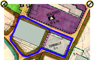 lila Linie: Geltungsbereich der Änderung: neue Nutzungseinheit „Sporthalle mit Mehrzwecknutzung und Parkplätzen“ / Grenze der neuen Nutzungseinheit = neue Baugrenze