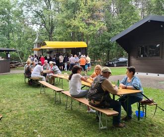 Alle Besucher sind herzlich eingeladen, den Tag an der Waldhütte zu genießen. Für Kinder sind Spielgeräte vorhanden.