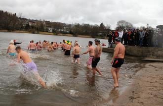 Dick eingepackt in Mütze, Schal und Winterjacke stehen am Sonntagnachmittag zahlreiche Zuschauer am Ufer des Baumholder Badesees. So mancher hat einen Regenschirm aufgespannt. Ein Kontrast dazu ist das, was sich direkt am Sandstrand abspielt. Dort stehen Männer mit nacktem Oberkörper, Frauen im Bikini. Die Hände um den Körper geschlungen. Bibbernd. Gleich werden sie ins knapp acht Grad kalte Wasser des Badesees springen - oder zaghaft und zögernd hinein gehen. Es ist Neujahrsschwimmen der DLRG Baumholder.