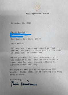 Was für eine Überraschung für Bernd und Melanie Mai: Der ehemalige US-Präsident Bill Clinton liest ihr Buch "Amerikaner in Baumholder", das sie 2022 veröffentlicht haben. Ein Dankeschreiben schickte Kevin Appleby, der in Baumholder aufgewachsen ist und Fußball beim VfR spielte. Er arbeitet mittlerweile im World Trade Center in New York und schreibt von seinem Familienunternehmen RUHL, das Mitglied in der Clinton Global Initiative, einer gemeinnützigen Stiftung, die sich Klimaschutz und Entwicklungshilfe verschrieben hat, ist. RUHL ist ein innovatives Ingenieurbüro aus Bad Kreuznach, welches sich mit globaler Gebäudedekarbonisierung beschäftigt. In diesem Zusammenhang trafen er und sein Geschäftspartner Michael Ruhl auf Hillary Clinton, die genau wie ihr Mann Bill im Buch erwähnt ist. "Ich habe der Familie Clinton eine Ausgabe des Buches versprochen und zugeschickt", so Appleby. Bill Clinton schickte daraufhin persönlich einen Brief. Für Bernd und Melanie Mai eine besondere Auszeichnung: "Unser Buch steht nun im Regal bei den Clintons, auch das ist ein Zeichen für deutsch-amerikanische Freundschaft", freut sich Melanie Mai. Zumal dem Besuch des US-Präsidenten 1995 in Baumholder ein ganzes Kapitel gewidmet ist. Übrigens: Als Dieter Bergisch vom VfR im Oktober zusammen mit dem Deutsch-Amerikanischen Partnerschaftskomitee die Partnerstadt Delaware in Ohio besuchte, machte er anschließend einen Abstecher nach New York - und besuchte Kevin Appleby.