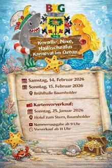 Am Sonntag, den 25. Januar startet der Vorverkauf für die beiden Prunksitzungen der Baumholderer Karnevalsgesellschaft am 14. und 15. Februar. Wer mit der BKG in See stechen und dabei sein will, wenn die Brühlhalle unter dem Motto „Koralle, Nixe, Haifischzahn – Karneval im Ozean“ in närrische Unterwasserwelten abtaucht, sollte um 09:00 Uhr im Hotel „Zum Stern“ in Baumholder aufschlagen. Dann erfolgt zuerst nach bekanntem System die Nummernvergabe, ab 11:00 Uhr der Vorverkauf. Der Einheitspreis für eine Karte liegt bei 12 €. Ab 11:30 Uhr wird zur Stärkung auch ein Mittagstisch angeboten werden.
