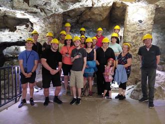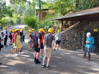 Stammtisch-Mitglied Marion Hoock hatte diese Tour organisiert und im Vorfeld mit den Verantwortlichen eine Führung am frühen Abend um 18 Uhr koordiniert. Am Steinkaulenberg angekommnen, wurde die Gruppe mit Schutzhelmen ausgestattet. “Dies dient zur eigenen Sicherheit, damit man sich nicht den Kopf stöβt beim Rundgang”, sagte Andreas Bodensteiner, der die Gäste durch den Besucherstollen führte. Er erklärte, in deutscher Sprache, die Geschichte, die Edelsteinarten, als auch die Arbeitsweise und Abläufe in der Edelsteinmine. Die amerikanischen Teilnehmer hatten Headsets, welche die Informationen in Englisch lieferten. “Die Arbeit muss doch unendlich anstrengend, nass und kalt gewesen sein”, sagte William Baldwin beeindruckt beim Verlassen den Stollens. Bodensteiner lies nicht unerwähnt, dass die Arbeiter in der Mine auch nur eine geringe Lebenserwartung hatten: “Viele sind nicht älter wie 40 Jahre geworden.”