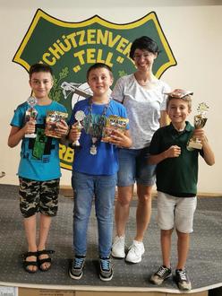 Sind auch die Zahlen im aktiven Jugendbereich, nicht nur wegen der Pandemie gesunken, freuten sich die drei Jungs vom SV Tell Rohrbach unter der Leitung ihrer Jugendleiterin, Sabine Geibel, ihr Königsschießen nach drei Jahren endlich wieder durchzuführen. Damit auch der Jüngste, Kasper Puk, nicht zu kurz kam, wurden der „Prinz“ sowie der Pokalsieger mit dem Lichtgewehr ausgeschossen. Hier zeigte Kasper seinem Bruder Jakub sowie seinem Freund Julius Alles was eine ruhige Hand ist. Mit 141 Ringen belegte er vor Julius 138 Ringe und Jakub 126 Ringe den 1. Platz. Ein 271 Teiler, 9,9 Ring, reichten für Jakub zum Titel „Prinz“. Nachdem Jakub und Julius dass Sportgerät gewechselt hatten, ging es nun auf den Holzadler. Trotz gezielter Schüsse zeigte sich dieser sehr Wehrhaft. Erst mit einem 206 Schuss schaffte es Jakub den Vogel von der Stange zu schiessen. Es gibt halt Tage im Schützenleben da gewinnt man fast alles. Nun hatten sich alle erst einmal eine Stärkung mit Gegrilltem verdient. Mit Pokalen, Orden und Königskette sowie einem Geschenk zeichnet, Sabine, ihre Schützlinge aus und wünschte ihnen einen schöne Ferienzeit.