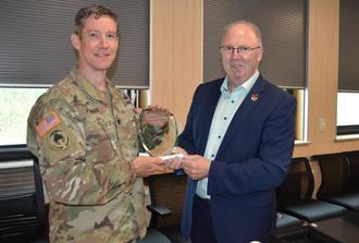 Bernd Alsfasser, Bürgermeister der Verbandsgemeinde Baumholder, überreicht Oberst Reid Furman zum Abschied eine Glastrophäe