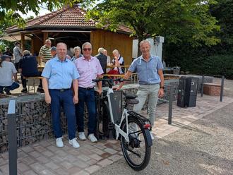 Bürgermeister Lutz Altekrüger, VG-Bürgermeister Bernd Alsfasser und OIE-Vorstand Thomas Johann freuen sich gemeinsam über die neue Lademöglichkeit für Radfahrende bei der Einweihung der E-Bike-Ladesäule in Rückweiler.