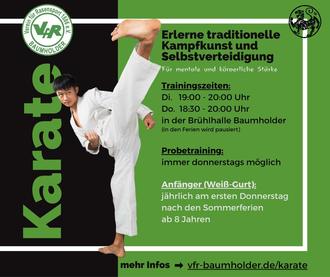 Du möchtest mehr Infos? Dann schau mal auf der Website vorbei (https://vfr-baumholder.de/karate.html) oder melde dich direkt bei unserem Abteilungsleiter (Johannes Bauerfeld 0176 73306697).