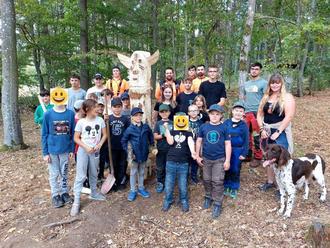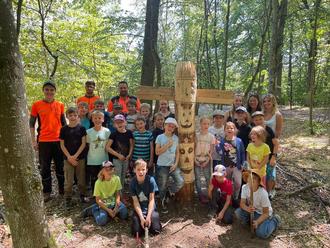 Ein besonderes Highlight war aber der Bau eines Totempfahls. Hier durften die Kinder vormittags Entwürfe zeichnen und die schönsten wurden ausgesucht und auf den Totempfahl übertragen. Hierzu engagierte Bernd Lischke mehrere Forstwirt-Azubis, die gekonnt mit Motorsäge die Kunstwerke vollendeten. Die beiden Totempfähle stehen im Anschluss an das Waldhaus rechts im Wald und können gerne angeschaut werden.