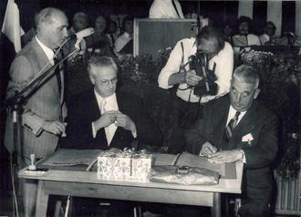Unterzeichnung der Partnerschaftsurkunde – Festakt in der Brühlhalle, v.l.n.r.: Amtmann H. Grimm, Bgm. Dr. Nagel, Bgm. Pierquin