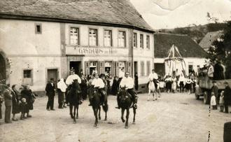 Bild vom Erntedankumzug, im Vordergrund Reitergruppe und dahinter der Erntekranz, aufgenommen in der Ortsmitte