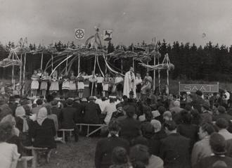 Wie vor 75 Jahren das Erntedankfest auf der Heide entstand: Der Zweite Weltkrieg war zu Ende und hatte auch auf der Heide tiefen Spuren, Not und Elend hinterlassen. Auf Initiative des damaligen Pastors Peter Bungart wurde 1949 das erste Fest unter dem Motto „Gedenken und Danken“ mit einem Festumzug ins Leben gerufen. Gedenken an die Opfer des Krieges und Danken dafür, dass im Vergleich zu den Vorjahren und der Kriegs- und Hungersnot eine gute Ernte eingefahren werden konnte. Der Erntedankumzug nahm damals eine andere Route als heute. Der Platz, an dem die Feierlichkeiten stattfanden, ist derselbe wie heute. Eigens zu diesem Anlass wurden dort auf einer Wiese vor Hahnweiler ein Holzkreuz mit einer Holzbühne errichtet und die Ernte gesegnet.