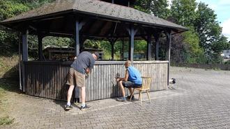 Am 14.08.24 haben sich zur Unterstützung von Christian Hayen, unserem Gemeindearbeiter, Alois Wahl, Jürgen Werle und Emil Bengel getroffen um die Grillhütte am DGM Haus abzuschleifen und neu zu streichen. Auch haben sie den Platz um das Haus von Unkraut befreit. Tatkräftige Unterstützung hatten sie ebenfalls von Julian, dem Enkel von Alois Wahl.