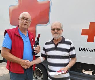 Beim letzten Blutspendetermin konnte der 2. Vorsitzende und Blutspendebeauftragte des DRK Baumholder Reiner Holtmeier eine Ehrung für 25-maliges Blutspenden vornehmen. Er überreichte Hans-Hein Schanz aus Baumholder die Ehren-Urkunde mit Ehrennadel des DRK Blutspendedienstes West. Auch der DRK Ortsverein bedankte sich bei Hans-Hein Schanz für dessen Engagement mit einem Weinpräsent.