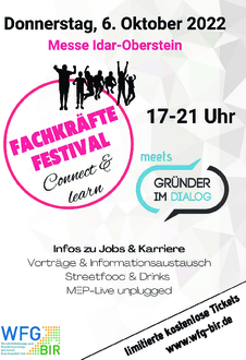 Am Donnerstag, 6. Oktober, findet von 17 bis 21 Uhr in der Messe Idar-Oberstein das Fachkräfte Festival statt. Unter anderem präsentieren 80 Aussteller Job- und Karrieremöglichkeiten. Darüber hinaus referieren Susanne Ditzer von der Industrie- und Handelskammer zu „Candidate Journey“ und Dr. Klaus Kühlcke von der Firma BioNTech zur Entwicklung von RNA-basierten Arzneimitteln.
