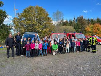 So gut gestärkt ging´s weiter zum naheliegenden Weiher von Fohren-Linden, wo bereits die nächste Überraschung auf die Kinder wartete: die Stützpunktfeuerwehr Berschweiler/Fohren-Linden und die Polizeiinspektion Baumholder waren mit mehreren Fahrzeugen vor Ort. Die Kinder konnten sich die Fahrzeuge ausgiebig ansehen, bei einer kleinen Feuerwehrübung dabei sein und sich über die Polizeiarbeit informieren. So konnten beide Einheiten neben dem Spaß für die Kinder auch in eigenem Interesse einen wichtigen Beitrag zur Nachwuchsgewinnung leisten.