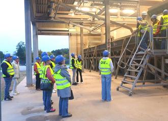 Die OIE-Gastgeber erklären der Besuchergruppe den Weg der Holzschnitzel