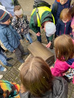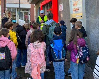 Auf kleinen zusammengerollten Zetteln, die wie geheime Botschaften wirkten, standen Hinweise auf das nächste Ziel. „Dort, wo man sein Geld abhebt und das Gebäude rot ist“ – lautete der erste Tipp, der die Kinder direkt zur Kreissparkasse führte. Dort durften sie sogar einen Blick in den Tresorraum werfen, was für große Begeisterung sorgte.