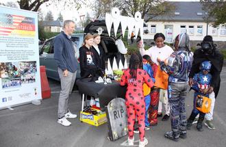 Verkleidet waren fast alle auf dem Platz vor dem Kino und der Hall of Champions in der US-Gemeinde. Ob als Vampir, als Monster oder auch als Prinzessin. Trunk or Treat ist eine Abwandlung des bekannten Trick or Treat. Statt von Tür zu Tür zu gehen, wird hier die Veranstaltung zentral auf einem Platz geboten. Die Kinder gehen von Auto zu Auto und sammeln ihre Süßigkeiten. Etwa 50 Autos dieser Art sind am Montagabend vertreten, wie ein Sprecher der US-Militärgemeinde mitteilt. Mittendrin auch ein Wagen des deutsch-amerikanischen Stammtischs. Dieser hatte angefragt, ob er denn mitmachen dürfe, als er davon erfahren hatte, dass nach zweijähriger Corona-Pause wieder das beliebte Event stattfinde. Auch Verbandsbürgermeister Bernd Alsfasser gesellte sich zu den Stammtischlern und verteilte Süßes, das er über das Programm "Welcome in Rheinland-Pfalz" finanziert hatte, genau wie Willi Bus, der mit einem historischen US-Jeep gekommen war. Alle Autos, nicht nur das des Stammtischs, waren entsprechend der Halloween-Tradition gruselig geschmückt. Mit Spinnennetzen, Grabsteinen oder gruseligen Gestalten. Auch hier war ein Harry-Potter-Kofferraum zu bewundern.