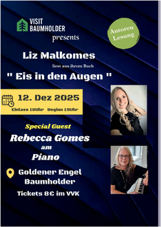 Am Freitag, 12. Dezember 2025, findet im Goldenen Engel in Baumholder eine Autorenlesung mit Liz Malkomes statt. Sie liest aus ihrem Werk „Eis in den Augen“, das von persönlichen Entscheidungen, innerem Aufbruch und Selbstreflexion erzählt. Musikalisch begleitet wird der Abend von Rebecca Gomes, Pianistin aus Tennessee (USA), die zwischen den Lesepassagen Klavierstücke spielen wird.