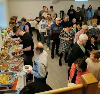 Schon früh am Sonntagmorgen traf sich der Vorstand und bereitete ein famoses Büffet für seine Mitglieder vor. Reich belegte Platten mit verschiedenen Sorten an Käse, Wurst, Spargelröllchen, gefüllten Eiern, Fisch und vieles mehr füllten eine große Tafel. Vier selbst gebackene Kuchen, hier ein Dank an die Mütter der Schützenjugend, gab es natürlich auch.