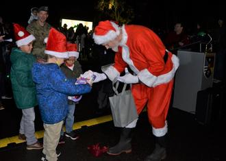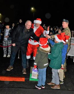 Etwa 500 Besucher sind zur Feier gekommen. Es ist eiskalt und nieselt. Die United Service Organisation (USO) verteilt Hotdogs und warmen Kakao. Jae Kim, stellvertretender Garnisonsmanager in Baumholder, begrüβt die Gäste - unter ihnen der Bürgermeister der Verbandsgemeinde, Bernd Alsfasser, Stadtbürgermeister Günther Jung und Oberstleutnant Jan Schmidt als Vertreter des deutschen Militärs - und kündigt die nächsten Redner an. Militärpfarrer Oberstleutnant Todd Cheney spricht das Gebet, bevor Garnisonskommandeur Oberst Reid Furman verspricht, “nicht lange zu reden, damit endlich die Lichter angehen und Santa Claus erscheint”. Furman ermutigt alle, die Feiertage im Kreise der Familie zu verbringen und die Last des Alltages abzulegen. “Wenn wir jedoch die Feiertage mit Freunden und Familie genießen, sollten wir unsere Brüder und Schwestern im Einsatz nicht vergessen, die in dieser Zeit fern von ihrem Zuhause sind und die Werte von Freiheit und Demokratie an so vielen schwierigen Orten auf der ganzen Welt verteidigen. Die Freundschaft, die wir hier in Baumholder seit mehr als 70 Jahren mit unseren deutschen Nachbarn pflegen, ist einzigartig und ein Geschenk.” Mit diesen Worten übergibt er das Mikrofon an Bürgermeister Alsfasser. “Mögen die Feiertage uns die Gelegenheit geben, die Freude am Leben und am Tun aufzufrischen und viel Zeit mit unseren Lieben zu verbringen. Im Namen aller Bürgermeisterinnen und Bürgermeister der Verbandsgemeinde Baumholder wünsche ich Ihnen ein friedliches Weihnachtsfest und ein ereignisreiches neues Jahr 2023”, sagte Alsfasser.