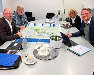 Besuch im Ministerium für Inneres, Bauen und Sport: von links nach rechts: Bürgermeister der VG Baumholder Bernd Alsfasser, Ortsvorsteher Eckhard Heylmann, Leiterin der Oberen Baubehörde Sandra Koch-Wagner und Staatssekretär Torsten Lang