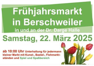 Am 22. März 2025 findet wieder der traditionellen Frühjahrsmarkt in Berschweiler statt. Das Detailprogramm wird in Kürze veröffentlicht. Interessierte Standbetreiber werden jetzt schon gebeten, sich bei Ortsbürgermeister Rouven Hebel unter gemeinde@og-berschweiler.de oder 0171 6923441 zu melden.