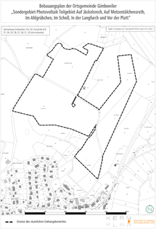 Der Gemeinderat der Ortsgemeinde Gimbweiler hat am 23.04.2024 die Aufstellung des Bebauungsplanes „Sondergebiet Photovoltaik Teilgebiet Auf Jäckelsrech, Auf Metzentälchensroth, Im Ahlgrübchen, Im Schoß, In der Langfurch, Auf Kirschborn & Vor der Platt“ sowie die Paralleländerung des Flächennutzungsplanes beschlossen um die bauliche und sonstige Nutzung nach Maßgabe des Baugesetzbuches (BauGB) und der Baunutzungsverordnung (BauNVO) zu ordnen und zu leiten.