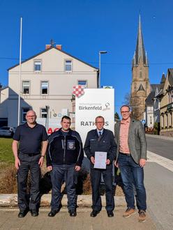 v. r.: Bürgermeister Matthias König überreichte Marco Ebert die Ernennungsurkunde zum stellvertretenden Wehrführer der Freiwilligen Feuerwehr Siesbach. Gemeinsam mit ihm freuten sich Matthias Hempe, Wehrführer der Freiwilligen Feuerwehr Siesbach und Lars Benzel, Wehrleiter der Verbandsgemeinde Birkenfeld.