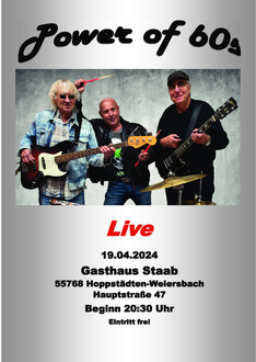 Hoppstädten-Weiersbach - Die Bühne ist bereit für eine unvergessliche Nacht voller Nostalgie und mitreißender Musik, denn am 19. April 2024 lädt das Gasthaus Staab in Hoppstädten-Weiersbach zur ultimativen Zeitreise ein. Ab 20:30 Uhr erwartet das Publikum ein Auftritt der besonderen Art, präsentiert von der neu gegründeten Band "Power of 60s".