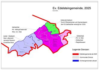 Am 29. Februar trafen sich die Presbyterien der ev. Kirchengemeinden Göttschied, Idarbachtal, Leisel, Siesbach und Veitsrodt-Herborn. Einstimmig wurden die Beschlüsse zur Neugründung der Ev. Edelsteingemeinde zum 1.1.2025 gefasst. Diese hat künftig drei Bezirke. Bezirk 1: Hattgenstein, Schwollen, Leisel, Siesbach, Mackenrodt, Hettenrodt, Kirschweiler und Tiefenstein. Bezirk 2: Veitsrodt-Herborn, Vollmersbach, Idar-Lay und ein größerer Teil von Idar. Bezirk 3: Algenrodt, Enzweiler, Göttschied, Gerach, Regulshausen und ein kleiner Teil von Idar. Jedem Bezirk ist eine Pfarrstelle zugeordnet. Zurzeit ist die Edelsteingemeinde personell hinreichend ausgestattet.