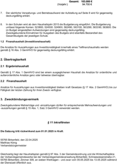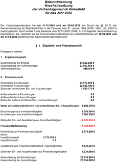 Bekanntmachung Haushaltssatzung der Verbandsgemeinde Birkenfeld für das Jahr 2025