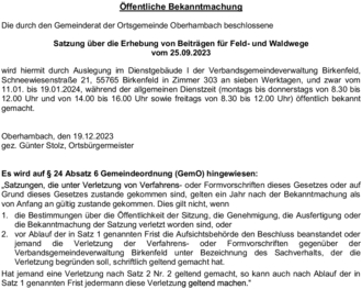 wird hiermit durch Auslegung im Dienstgebäude I der Verbandsgemeindeverwaltung Birkenfeld, Schneewiesenstraße 21, 55765 Birkenfeld in Zimmer 303 an sieben Werktagen, und zwar vom 11.01. bis 19.01.2024, während der allgemeinen Dienstzeit (montags bis donnerstags von 8.30 bis 12.00 Uhr und von 14.00 bis 16.00 Uhr sowie freitags von 8.30 bis 12.00 Uhr) öffentlich bekannt gemacht.