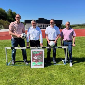 Wieder beste Bedingungen für Fußball spielen, Leichtathletik und den Sportunterricht herrschen nach der Sanierung im Birkenfelder Stadion „Am Berg“. Dessen Betriebsträgerschaft hat nun der Kreis übernommen, was bei einem Vororttermin für VG-Bürgermeister Matthias König, Landrat Miroslaw Kowalski, Stadtbürgermeister Hans-Peter Lampel und Mark Hartenberger, den stellvertretenden Leiter der Bauabteilung in der Kreisverwaltung, Anlass für ein gemeinsames Foto war. Auch ein Erinnerungsstück an die Anfangstage der vom SCB gebauten Sportstätte kam mit aufs Bild – das Plakat des Freundschaftsspiels, mit dem am 20. Juni 1986 das Stadion eingeweiht wurde. Damals gewann der SV Werder Bremen mit dem Starstürmer und späteren Weltmeister Rudi Völler gegen die legendäre Oberligamannschaft des SCB vor 9000 Zuschauern mit 5:0.
