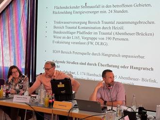 Ein weiterer Übungspunkt war die Krisenkommunikation. Dazu gehörten das Verfassen von Pressemitteilungen und die simulierte Durchführung einer Pressekonferenz mit dem Bürgermeister, dem Wehrleiter und dem Stabsleiter – allerdings ohne tatsächliche Medienbeteiligung.