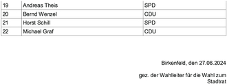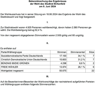 Bekanntmachung des Ergebnisses der Wahl des Stadtrat Birkenfeld am 9. Juni 2024