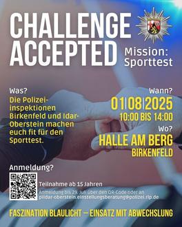 Dann übe mit uns den Sporttest! Am 1. August von 10 bis 14 Uhr bieten die Polizeiinspektionen Birkenfeld und Idar-Oberstein gemeinsam die Möglichkeit an, auf dem Gelände der Halle am Berg den Sporttest unter Anleitung zu üben.