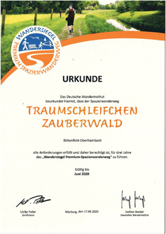In der Verbandsgemeinde Birkenfeld wurde in diesem Jahr ein weiterer Premium-Wanderweg erfolgreich rezertifiziert. Durch das Deutsche Wanderinstitut erfolgt alle drei Jahre eine Nachzertifizierung der Premiumwanderwege, dazu zählt auch das Traumschleifchen Zauberwald als Premium-Spazierwanderweg. Dieses besondere Wander-Erlebnis rund um Waldmeister Willy Wurzel wurde nun erneut für seine herausragende Qualität und seine vielfältigen Attraktionen mit dem Premium-Wandersiegel ausgezeichnet.