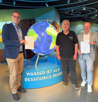 Im WasserWissensWerk des Wasserzweckverbands in Kempfeld: Der neue stellvertretende Verbandsvorsteher Matthias König (links) und der neue Verbandsvorsteher Bernd Alsfasser (rechts) erhalten vom bisherigen Verbandsvorsteher Uwe Weber ihre Ernennungsurkunden.