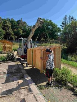 Darüber hinaus umfasst das Areal einen Hasenstall, Hochbeete und weitere Sitzgelegenheiten. Der Hasenstall konnte mit tatkräftiger Unterstützung vom städtischen Bauhof, Mitarbeiter Reiner Schuch, sowie dem ehrenamtlichen Helfer Florian Biegel, der sich täglich für den Tierpark engagiert, aufgebaut und installiert werden. Um den Tieren künftig Schatten zu bieten und den angrenzenden Hang zu begrünen, wurden drei Obstbäume sowie bodendeckende Pflanzen angeschafft, die in den kommenden Tagen gepflanzt werden.