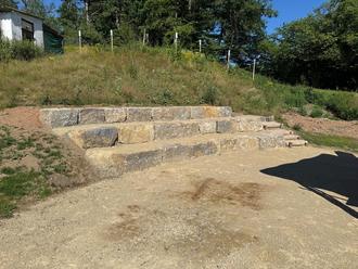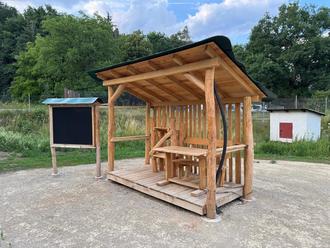 Im hinteren, rechten Bereich des Parks wurde ein „Grünes Klassenzimmer“ eingerichtet, das nun Schulklassen, Kita-Gruppen und Umweltbildnern zur Verfügung steht. Drei Sitzreihen aus Muschelkalk-Quadersteinen bieten Platz für eine ganze Klasse. Gegenüber wurde ein überdachtes Pult mit Tafel installiert, das etwas geschützten Unterricht im Freien ermöglicht.