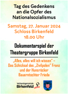 Am 27. Januar, dem Tag zum Gedenken an die Opfer des Nationalsozialismus, lädt die Theatergruppe Birkenfeld zum Dokumentarspiel „Alles, alles will ich wissen“ über das Schicksal des „Zivilpolen“ Franz und der Hunsrücker Bauerntochter Frieda ein. Frieda Gregorius wurde wegen Rassenschande verurteilt, weil sie ein Kind von dem polnischen Arbeiter Franz bekam, und starb später im Frauenkonzentrationslager Ravensbrück.