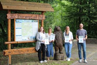 Die Vertreter*innen der beteiligten Tourist-Informationen Nohfelden, Birkenfeld, Baumholder und EdelSteinLand nahmen am Bärenpfad in Nohfelden die Zertifizierungsurkunden des Nahesteigs in Empfang. Hier befindet sich seit seiner Verlängerung ein neuer Startpunkt des nun rund 41 km langen Nahesteigs, der nun mit 86 Erlebnispunkten zertifiziert wurde.