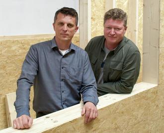 Geschäftsführer Alexander Tjutjunnik und Technischer Leiter Andreas Lindt präsentieren stolz das erste CO2-negative Modulhaus im Werk Birkenfeld.