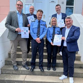 VG-Bürgermeister Matthias König, Polizeidienststellenleiter Steffen Gutendorf, die Polizeihauptkommissare Andreas Georgi und Sandra Warken, der Erste Stadtbeigeordnete Tobias Kowalski und Landrat Miroslaw Kowalski (von links) freuen sich über den offiziellen Abschluss einer Partnerschaftsvereinbarung, die der Stärkung der objektiven Sicherheit und des Sicherheitsgefühls der Bürger in der Stadt und der Verbandsgemeinde Birkenfeld dienen soll.